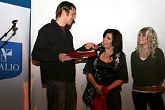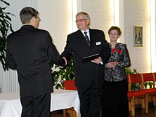 Ilkka Yliluomalle (kesk.) arvonimen luovutti Atrian hallituksen puheenjohtaja Martti Selin. Oikealla Anna-Leena Yliluoma. Kuva Sami Karhu |