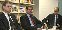 Seppo Laakso, Vesa Vihriälä ja Martti Hetemäki osallistuivat PTT:n tilaisuuteen Helsingissä tiistaina. Kuva M Nummi |