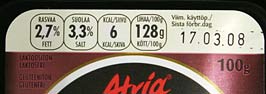 Yllä Atrian omat ja alla GDA-suosituksen mukaiset merkinnät Kariniemen tuotteessa.